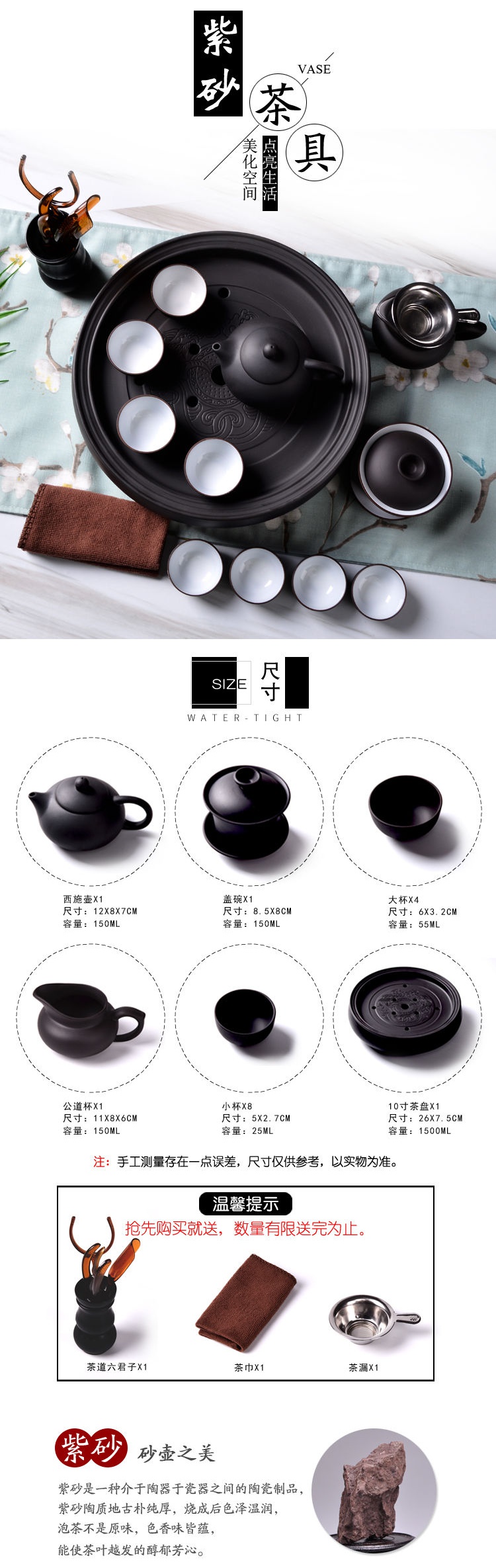 江辰樂紫砂功夫茶具套裝茶杯茶壺茶盤整套陶瓷茶具圓形茶洗蓄水家用茶器
